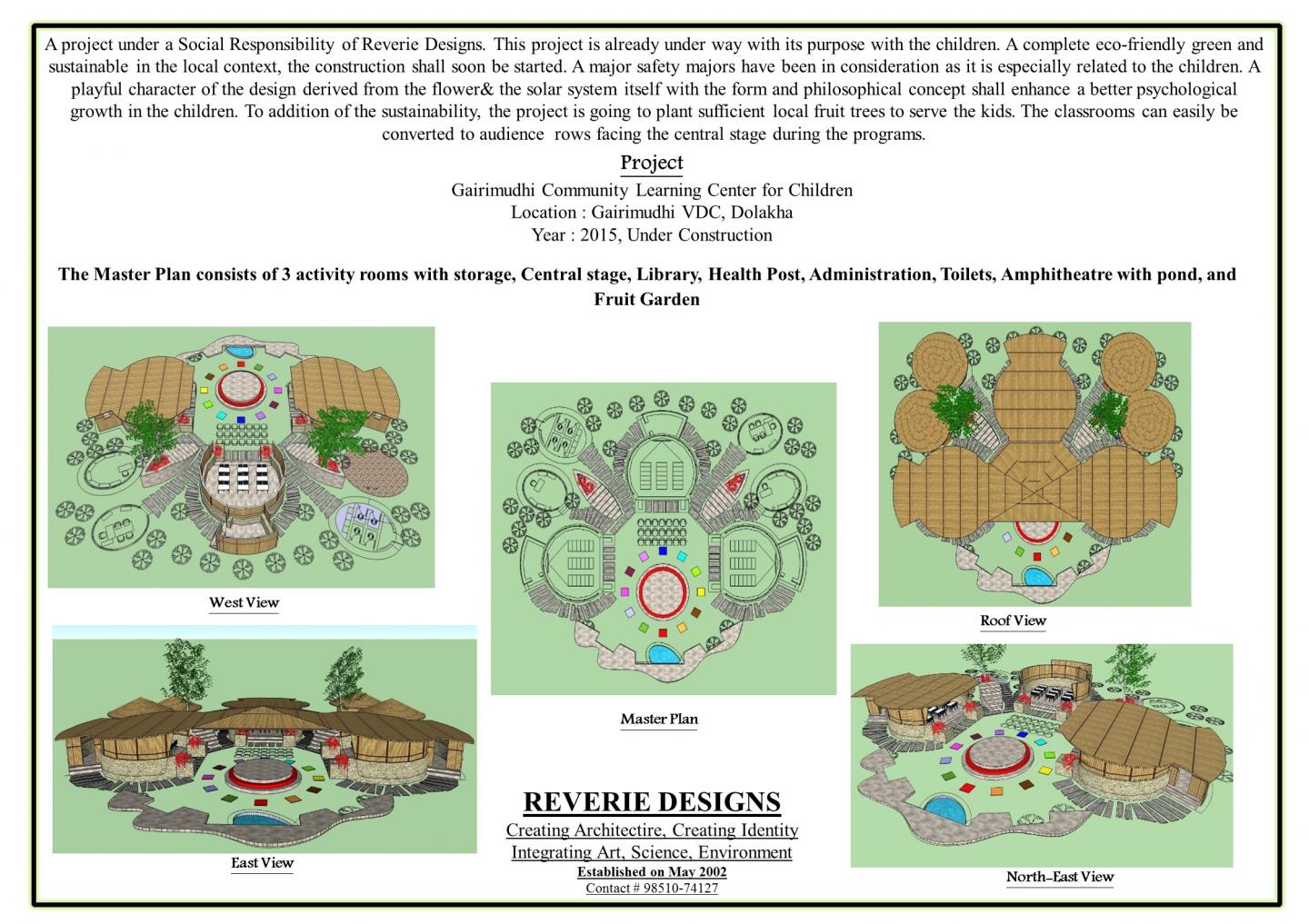 A project under a Social Responsibility of Reverie Designs. This project is already under way with its purpose with the children. A complete eco-friendly green and sustainable in the local context, the construction shall soon be started. A major safety majors have been in consideration as it is especially related to the children. A playful character of the design derived from the flower & the central stage in a solar system itself with the form and philosophical concept shall enhance a better psychological growth in the children. To addition of the sustainability, the project is going to plant sufficient local fruit trees to serve the kids within the project site. The classrooms can easily be converted to audience rows facing the central stage during the programs.