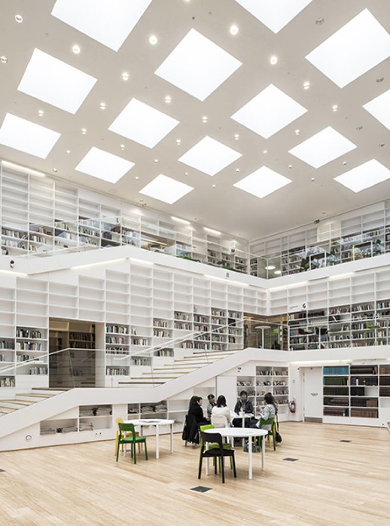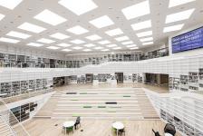 The spiral of knowledge creates a variated study environment allowing the students to move about in the heart space of the library or to withdraw to more quiet and tranquille areas along the facade. The variation of sound levels and the differentiation of activities creates a versatile library that is rich in experiences. The building has its very own spatial character uniting library and multi media functions to create synergy with the existing university complex.