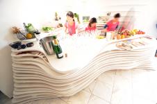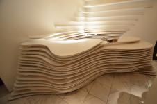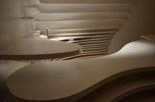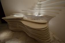 The counter slides through the wall, while the spiral runs along a smooth curved surface reaching to the ceiling.