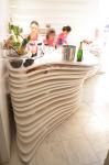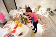 The service side of the counter also creates a space in which multiple people can work at the same time thanks to the easy-to-use form of various heights by work-unit.