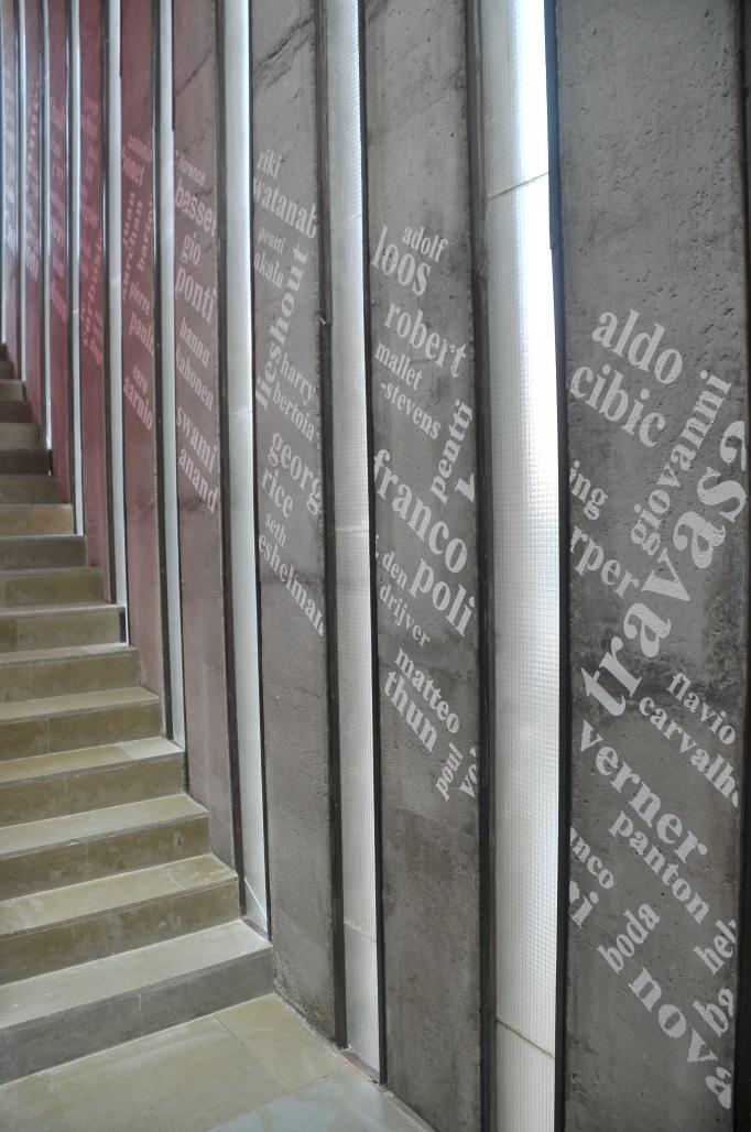 As one ascends the ongoing flight of steps that connect the lower ground with the double volume living floor and the glazed top; three levels get linked spatially via this concrete face. It adds to the art and design philosophy of the clients.