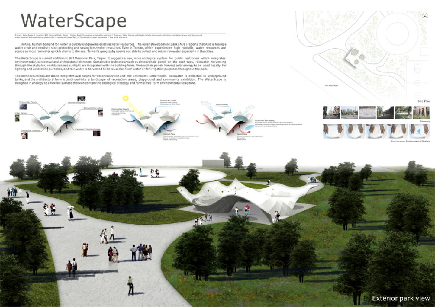 The WaterScape is a small addition to 823 Memorial Park, Taipei. It suggests a new, more ecological system for public restrooms which integrates environmental, contextual and architectural elements. Sustainable technology such as photovoltaic panel on the roof tops, rainwater harvesting through the skylights, ventilation and sunlight are integrated with the building form. Photovoltaic panels harvest solar energy to be used locally for lighting and ventilation purposes, and rain water is harvested to be reused as flush water or for irrigation purposes throughout the park.