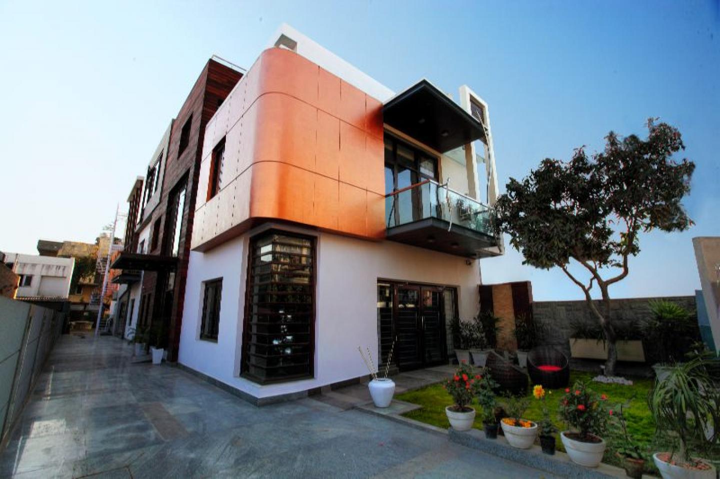 The building has been perceived as a modern house where emphasis has been given to lot of detailing and use of materials. As a rectangular block the massing was a challenge, the front corner elevation has a copper painted block balanced by a rectangular framed structure in front of the first floor balcony. The simple front exterior has a contrast use of elements and texture on the side where wooden cladding above entrance lobby continues and connected to the second floor at the front elevation. Similarly cement finish block protrude out from the second floor with big sliding windows. Perforated vertical wooden panels break the monotony and create interest and are replicated at the first floor balcony below. The staircase wall has double height windows panels with precast column and a customized metal frame supports glass and creates visual delight to the eye. The copper paint on the angled block at the rear complemented to the front one. The yellow ochre paint on the front of the servant room is framed by beam structure; highlights the building at rear. The rear elevation has big glass panels where in a cantilever glass platform extends from first floor act as balcony overlooking the private lawn.