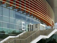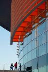 Secondly, rather than accomplishing an introverted typology, an extraverted design was considered. A transparent façade and terraces on certain levels were designed in order to render inhabitants develop visual relationships with the city in every direction. Diverse architectural elements, which are put layer by layer from the outside to the inside, such as tension rods, white horizontal sunshades, orange vertical sunshades, curtain wall, brut concrete columns, white foyer walls, green colored entrances, orange public toilet walls, increase the depth of view from the outside to the foyer walls behind. The building’s volumetric effect is decreased not only through the transparent façade, but also through rendering 15 m. cantilevered eave structure thinner, like the wing of an air craft. The eaves have depth only of 12cm. on the front, and become 7,5m. in the center in order to carry the giant screen. Sunshades not only bring depth of view; but also give color and rhythm to the façade as well.