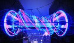 Cilindrical Tensile Membrane + Double Helix Structure made of carbonfiber semiflexible tubes. This simple and flexible module can be repeated according to the desired lenght connecting two buildings forming a pedestrian connection.
