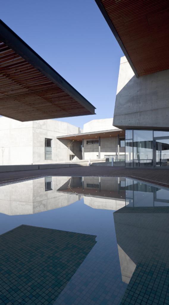 In the private areas, thick walls provide climate protection, which is so essential in the Negev desert. In contrast, in the public areas the thin roof that caps the building provides shade and protection of the interior regions, and also creates a variety of external spaces where it is pleasant to relax.