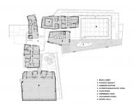The rocks enclose rooms for private and more intimate functions, while in-between spaces serve as public areas in the building. Thin bridges spanned over those areas enable passage between public spaces, which reinforces the experience of the building for the users.
