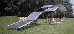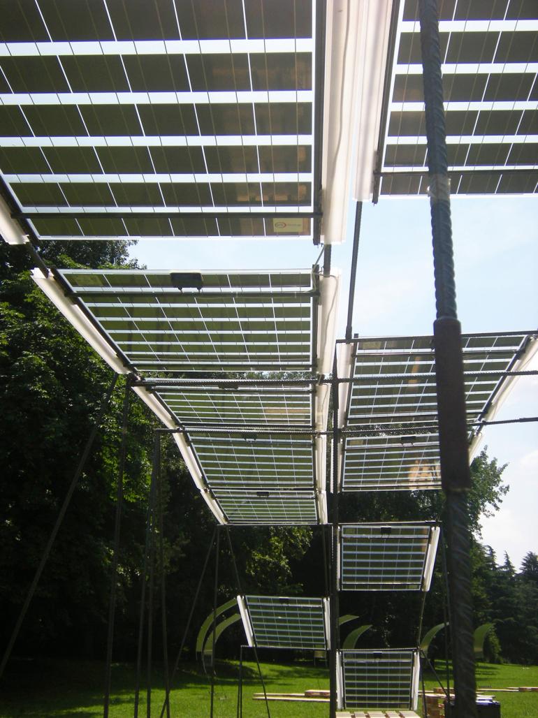 The photovoltaic panels (12), sustained by alight iron rod structure, provide energy, shadow or lighting (through neon lamps), and wrap a “familiar” environment in the nature.