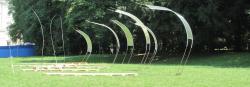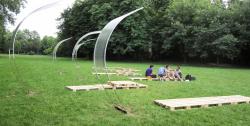Shading flexed elements, built with iron rods reinforced plastic profiles sustaining polycarbonate light panels, define points of aggregation as well flexible single thin plastic profiles, floating with the wind or with the interaction with the public, provide illumination, through the use of led lights. Pallets are transformed in deckchairs.