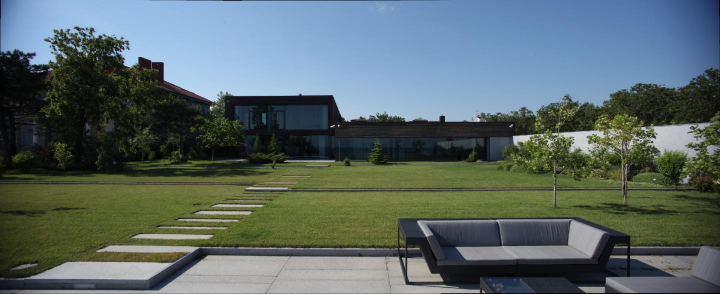 The combination of two volumes was arranged in such a way so as to allow an uninterrupted sightline between the sea and the house situated behind our plot. The location of the house itself was largely determined by the desire to preserve as many of the existing trees as possible. Another important factor was the necessity to create a harmonious interrelation between the house, the garden and the sea view. These three environments are placed each along its own line and they interact in a variety of ways, depending on the position of the observer (whether it is the garden, the house or the mirador).