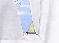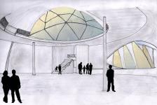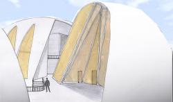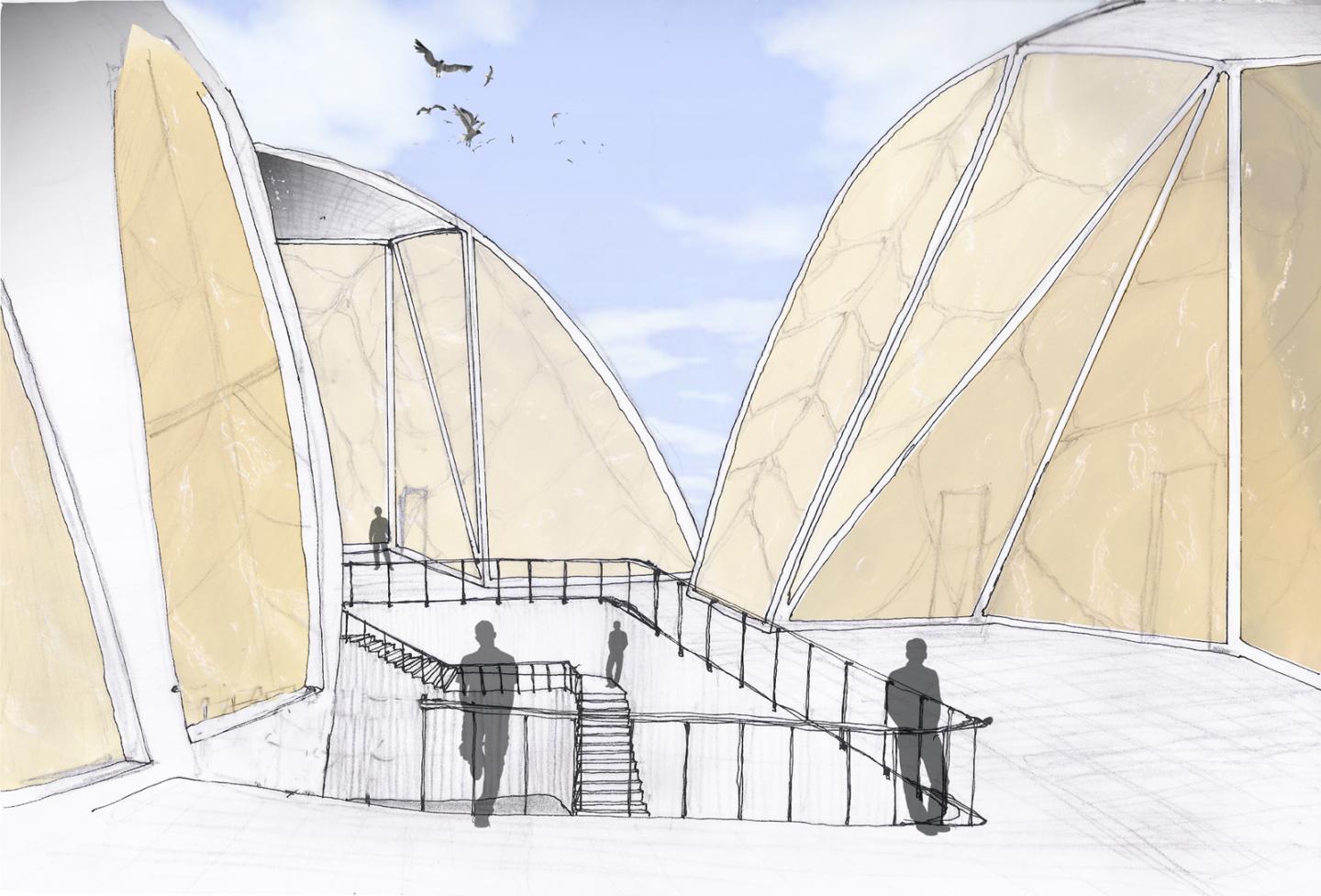 A sweet lime was sliced and various study drawings were made. From here, evolved the translucent membrane that would diffuse the sunlight and create nice soothing working environments.