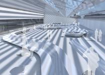 The whole structure through its “sloppy” nature, is totally accessible from the ground. It actually invites the users to walk all over its surface as they would do in a civil square, offering views to the sea and the city, as well as places to rest and relax. The shell of the building is blending with the landscape. It is accessible from almost everywhere as it is the natural continuity of the outer common space. A large cascading seating area is situated at the back of the building in order to host outdoor activities. It is designed as a whole entity so that the indoor activities and happenings can be transferred outside when the weather allows so. The building, the surrounding common space and the walking promenade on the top of the volumes, are the discrete elements that consist the whole of the Busan Opera House.