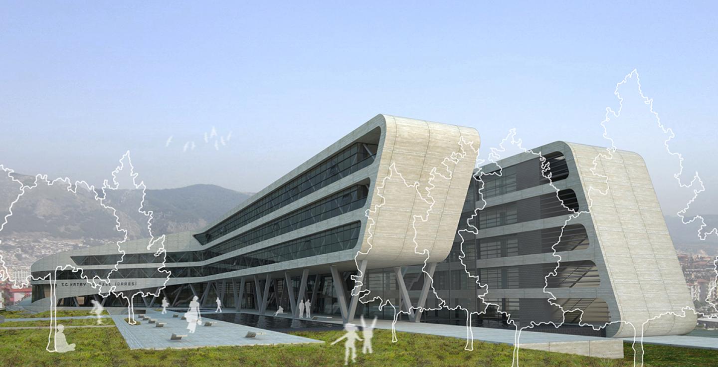 The office spaces were lined up next to each other within a depth of maximum 8m, and a gallery space of 10m width was created in between, in order to benefit from cross ventilation in the mild Mediterranean climate of Hatay.