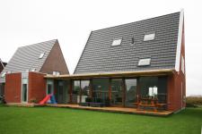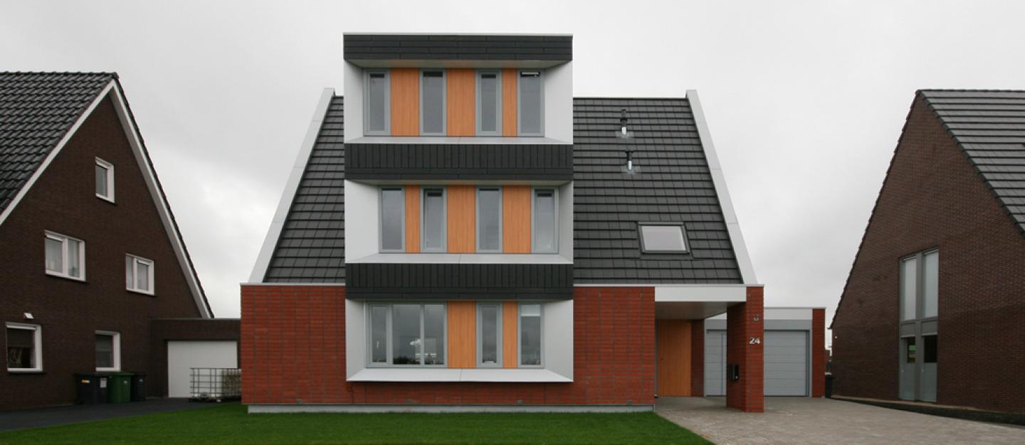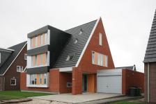 The sturdy steel plinth that lifts the home of the surface is immediately noticeable. Large, bright red in stacked bond masonry brick enhances the tough appearance. In the matt timber front facade the shiny aluminum is a real eye-catcher. The sharp angles in these aluminum frames reflect light in different directions. This gives a playful effect. The light gray PVC window frames in the side facades are placed in the plane of the brick facade to strengthen the abstract image.