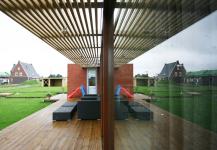 There is a lot of space inside and every inch of the space is used wisely. Carefully placed lights define space for lounging, dining and cooking. The see-trough fireplace both separates and unites the television room and the kitchen. White interiors, huge transparent voids covered with glass and parallel doors along the house also help to create more of space inside.