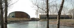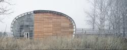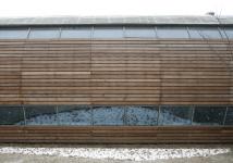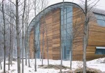 In order to reduce the building massing, concrete arch structure with a span of 18 meters is adopted for all the three buildings, with the space between arches being 6 meters. The training center and the communication center are of single arch structure; the staff kitchen is of double arch structure, with the two arches spacing out half a separation distance in plane arrangement to ensure the completeness of the concrete arches. The external enclosing structure is warm-isolated profiled sandwich steel panels supported by steel beams. The cedar wood planks are fixed on the steel panels as material of building skin. And varnish is adopted to maintain the wood texture so that the buildings can be better integrated into the poplar grove.