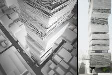 The cubature created in this way is a pile of simple, basic geometric shapes – boxes piled up one on another according to the assumed order of the plan of the building and their mutual shift. The pile of shifted boxes is a partitionned 100-metre tower. Dividing the space helps reduce the volume of the building mass optically and helps relate the horizontal directions to the height of the sourrouding buildings. The pile of boxes has been cut through by horizontal straigt lines thus creating stripes of glazing wrapping around the building and providing a 360 degrees view.