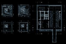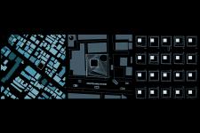 The pile of ‘programme squares’, raised above the city level, has been processed further, preliminarily moving them around clockwise within the borders of the plot. Each of the ‘pile’ levels have been allocated certain functions, in order of the assumed and transformed functional programme and of a diagram of mutual spatial and logical relations.