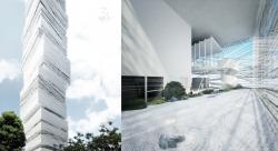 The whole structure of the building, from the entry yard to the top of the tower has been wound with a homogenic lether relating to the basic fabric of every fashion designer and constituting the base of every collection, ie textile fabric and its material – thread, fibres. Fibers of the fashion museum are lead in two rows – one layer of fiber winds around the building clockwise, the other one anti-closkwise thus resulting in a kind of a plaiting. The plaiting is then modified adjusting the meshes and its density to factors such as lighting conditions, view openings and overall composition. Fibres of the fabric winding around the museum cross at different angles, creating either a dense net or wide meshes locally, providing a full opening of the building.