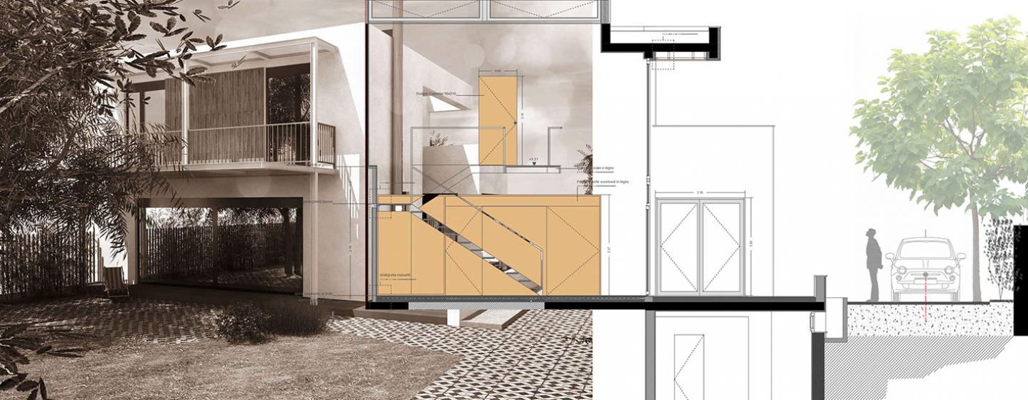 The context is characterized by residential buildings of one or two floors. The building is on two floors above ground and a basement, the volume contains two symmetrical units. The internal volume of each unit is divided into two areas by a full-height distribution space covered by a sloping ground and illuminated by a skylight in the north. The program includes three bedrooms, a dining area and living room, a kitchen and two toilets. On the main facade to the south, the stay is in continuity with the garden through a large window and mediated by a pergola that becomes the upper floor balcony to the two boys rooms. In the basement there is a car garage and utility room. The coverage of the double-height volume houses the photovoltaic system. The materials chosen are: stone for the base, white plaster to the upper floor and steel for the pergola.