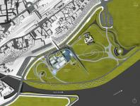 Within this composition, the NTCArt Children’s Museum is conceived as a 2-story container distinct from the main Museum, within which individual program elements as well as a series of exterior voids are arranged. The Children’s Museum is located at the point at which the screen wall emerges from within the landscape to provide an immediate relationship to both the lobby and the park. The landscape slopes up onto the roof, offering views to and from the interior and providing direct access from the park. Conceived as a sunken “toybox” in the park, children are encouraged to experience the park and museum together as the limits of each are left unclear.