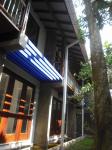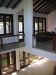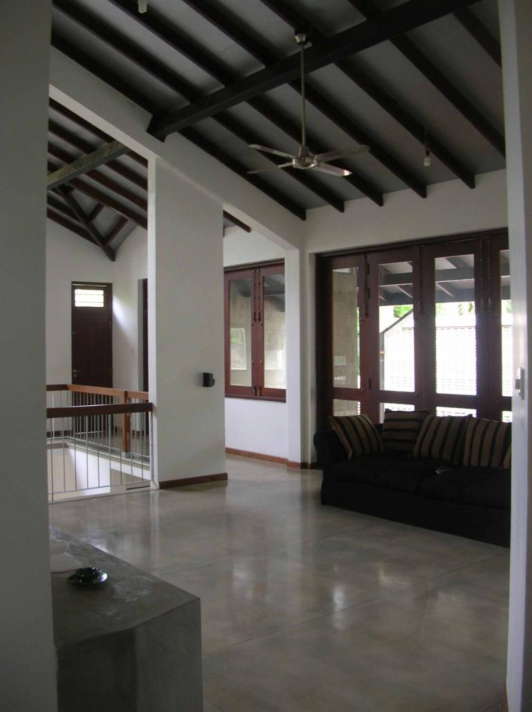 This house for a child heart surgeon husband and his doctor wife was designed as a narrow linear introvert house overlooking a continuous strip garden courtyard by the side. House was designed in a mono pitched lean to roof with a thin section to encourage cross ventilation. This lean to roof mono pitched roof gives a cathedral like exaggerated height to the upper floor areas such as family living , tv room and master bedroom. Each and every room whether the living, pantry guest bedroom in ground floor or library, master bedroom in upper floor overlooks this narrow linear courtyard garden running along the full length of the house. Existing mature trees were retained in the site allocating specific courtyards for further growth. Limited palette of finishes were employed to the residence such as titanium dioxide cement floors, smooth cement rendered exterior, timber deck balconies, white washed interior walls to enhance the simplicity. Double height living dining hall was sparsely furnished to further increase the simplicity of the house. Guest bedroom in ground floor was juxtaposed with a trapped courtyard while the attached toilet was also left with an open to sky courtyard area. Small shallow narrow linear reflective pool was also incorporated along the intermediate space between the house and the garden. Narrow linear garden courtyard was tastefully landscaped with root ball replanting of several mature trees, grass lawn and strategically positioned pebble courts.