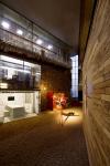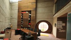 The entire building is divided into five distinct functional components, exaggerated by a completely different use of material and technology. The main studio is an economical framed structure of glass. The office files, samples and models which are placed along the external skin make the facade a collage of materials and colors. Hence, creating a palette which truly represents life inside out! The circular rotunda of brick takes in all the services. Its top transfers into a perfectly circular amphitheater for two hundred people. The south face is obstructed with a three meter thick stone wall. This wall is hollowed at various levels to house playful glass meeting rooms which create an incredible internal visual dialogue. The atrium metal roof extends itself into a metal box as it scales into a badminton court. Last but not least is the triangle of concrete which, gets its shape by virtue of the plot. The first level is a state-of-the-art concrete table, above that is a design studio and lounge that sits three floors high.