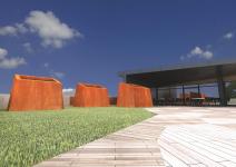 The building has four basic material components, namely Architectural Concrete, titaniumzinc, glass and cor-ten. Architectural Concrete and titaniumzinc covers basic content in the exterior, while the cor-ten accents in the form of skylights and wall of the main entrance. The facade from the north side is very multiple and hard to read. The total size of the object looks less. This is because the family houses opposite. In the extended glazed parts are communication cores. Terrace is partly covered by WPC and partly is green. Green part of an area with less incidence of customers. In this section is located the skylights and partially obstruct customer`s view of the street. the part of the terrace has a side wall towards the street. All these elements have to reduce the emission of noise from the bar because of the family houses.