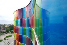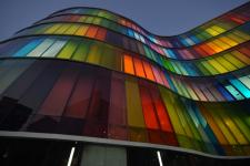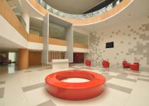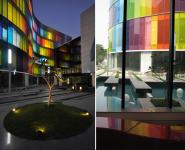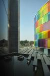PEOPLE + CITY (Community - The Productive Collision) 1.The site, situated in a very dense residential urban fabric, was a huge constraint and dictated linear planning. Special efforts were made to ensure creation of non-monotonous spaces which did not follow expected linear pattern. 2. The chromatic glass façade comprises of 2 layers of 5mm clear glass each with an intermediate PVB layer 1.2mm thick which acts as an insulator, reducing the heat buildup inside. The façade becomes more dynamic by night when the inside lights are switched on and has a mesmerizing effect on the plaza below. 3. Circulation spaces and spill out zones have been created along the curved glass façade, allowing them to be naturally lit in the day and giving them a more interesting and dynamic feel. Emphasis has been given to interaction points not just for students but also for the faculty encouraging exchange of knowledge and ideas at all levels. 4. The reception has been designed as a triple height space naturally lit by a huge skylight above. The corridors and spill out spaces culminate around here at the upper floor levels. Care has been taken to ensure that the library is also well lit during the day and has been designed such that it is surrounded by glass on three sides, shaded by the existing trees on site. 5. Color has subtly been introduced in the interiors as well in the form of colored glass partitions, colored glass slits on the wall or simply in the furniture. Color has subtly been introduced in the interiors as well in the form of colored glass partitions, colored glass slits on the wall or simply in the furniture.