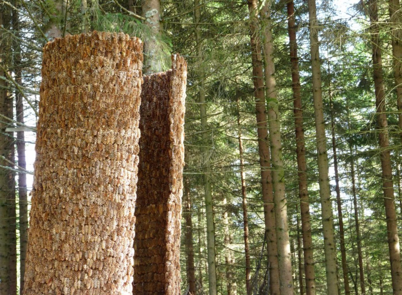 Since its conception, the project process was closely joint to the surroundings that lodged it. Walking through the woods and collecting the material to create a handmade natural skin which varies in textures and in tones. A material that acquires a symbolic connotation. Seeds from where the forest is born and which return to dialogue in a new way with nature, defining the transformation cycle of the piece.
