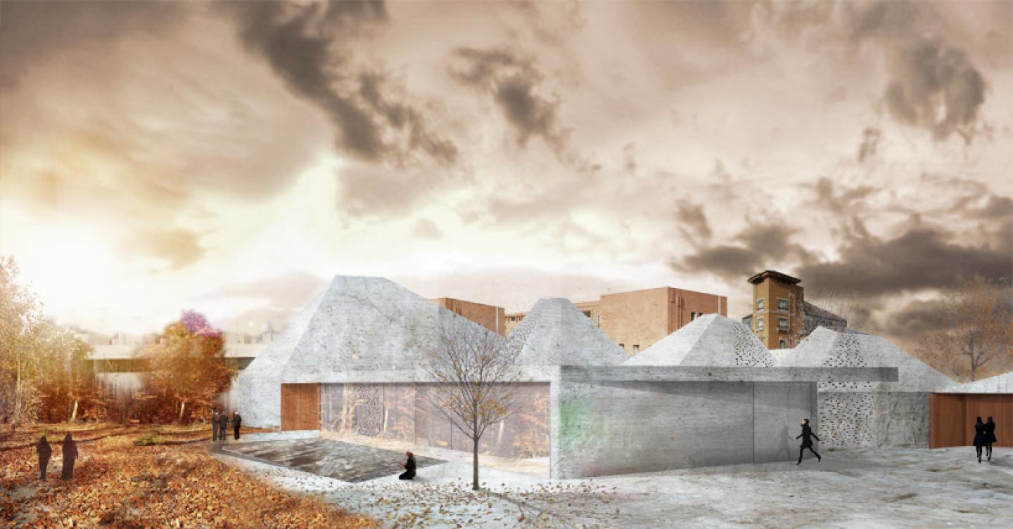 The shape raises from the ground to define the street in an attempt to control the permanent link between the introspective forested area and the existing graveyard space annex. Thus a new block is given to the city with a space for reflection, providing an environment not exposed directly to the public.