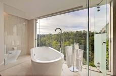 The private areas are located at the top floor in which large windows were also incorporated to make the most of the views. In the master bedroom the window is framed by a bookcase designed specifically for the needs of the space that enhances the view and makes it cozier. The bathroom is a large space from which you can also enjoy spectacular views; the washbasin was located at the center.