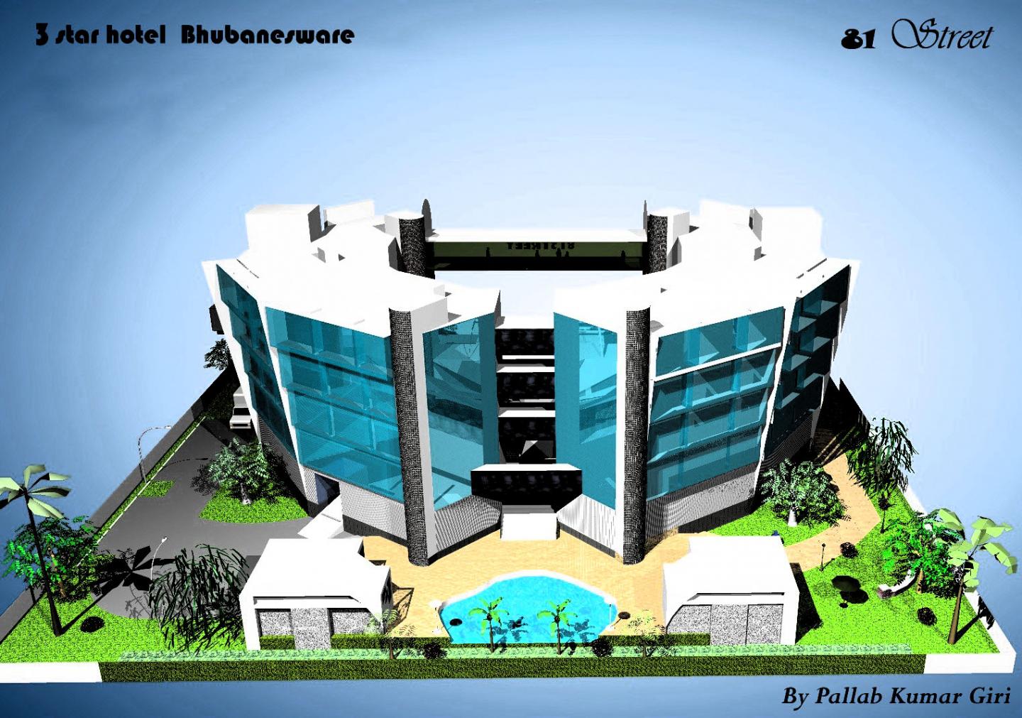81 STREET THE HOTEL DESIGNED AS PER BRIEF. THIS IS A INOVATIVE STRUCTURE FOR SHOWING THE HEIRARCHY OF FLOORS AND THEIR PROJECTIONS. . THIS IS A GLASS STRUCTURE HAVEING MANY CONNECTING BRIDGES .