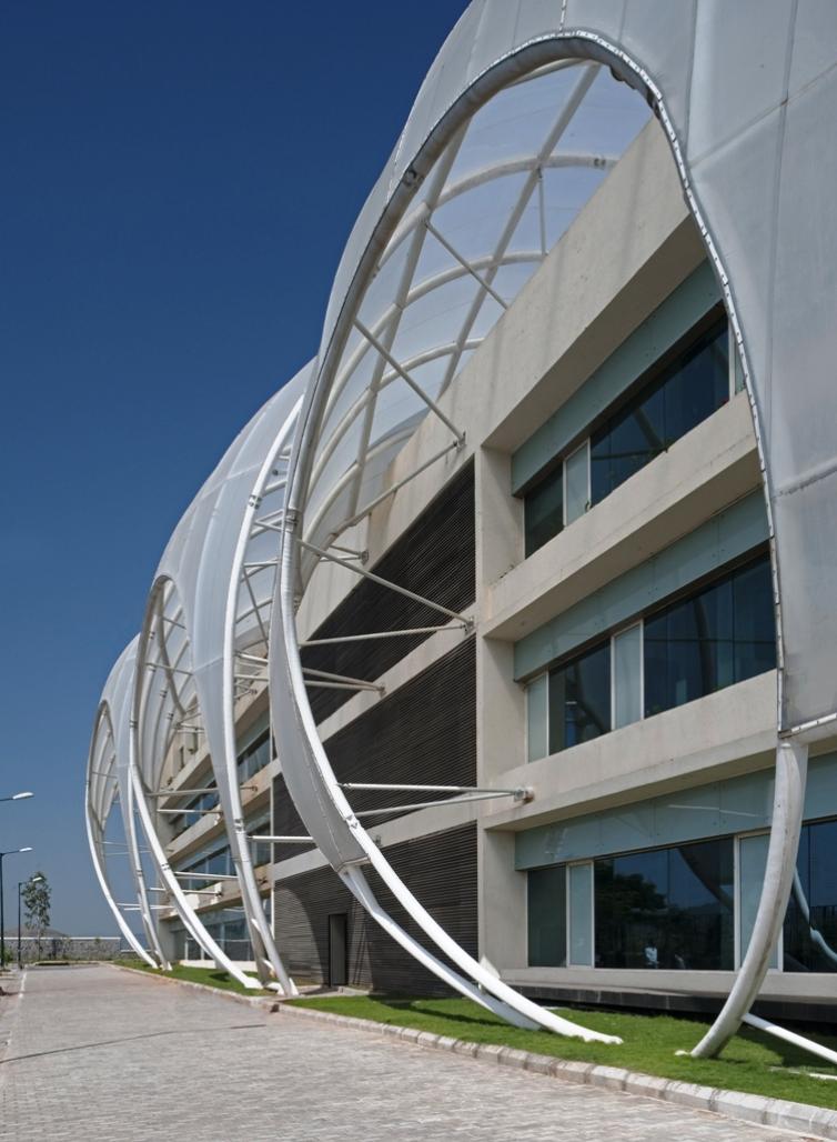 External finishes use textures paint for walls and aluminum louvers for service areas and staircases. Maximum glazing happens on the east, north and south side. The south side glazing is shaded by three storied fabric-covered structures. The fabric is a semi-transparent, washable material, transparency enough to display the structure behind.