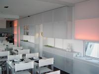 Inside, the space is characterized by rationalization and simplification of the parts, with the functional background restaurant wall, that hides all the service areas of the restaurant.