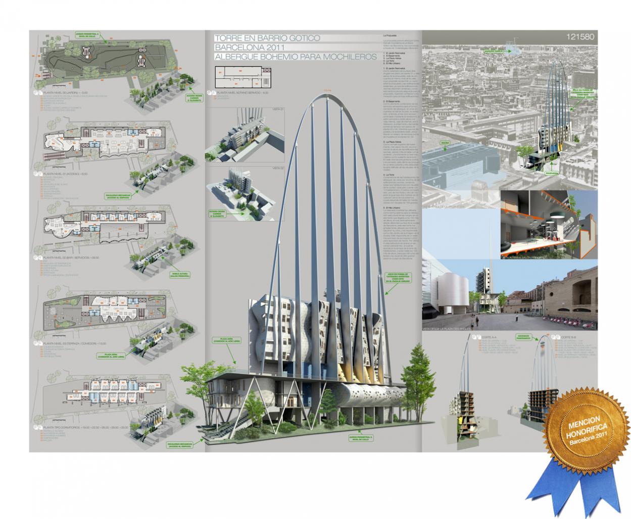 Propuesta ganadora de la mención honorífica en el concurso Internacional de Arquitectura BARCELONA 2011 Torre en el Barrio Gótico / Albergue Bohemio para Mochileros