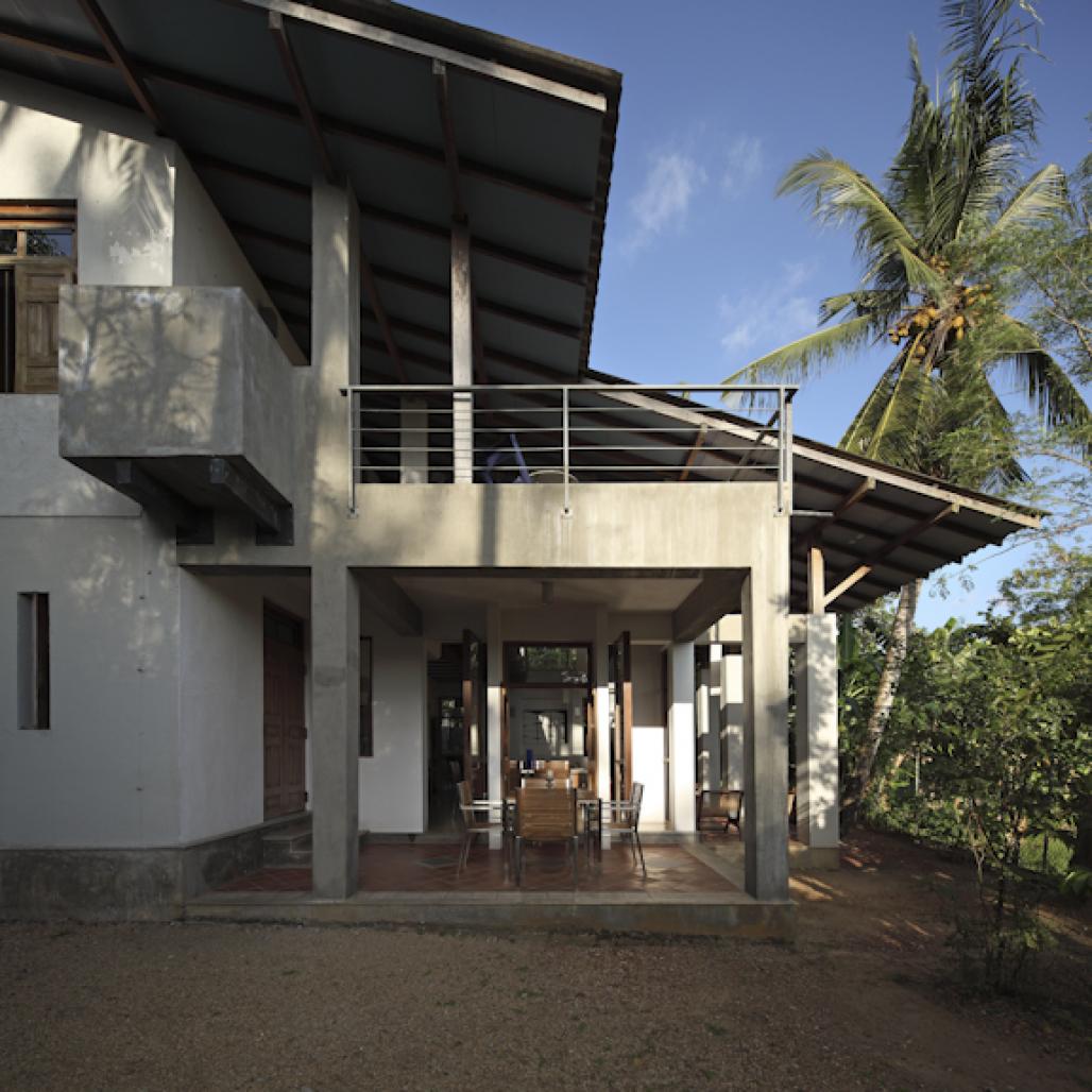 This Simple mono sloped steep roofed House is designed to overlook the adjoining Diyawanna Marshes with ample use of double height spaces. It was designed, as an extension to an existing two-storied old house with its two storied part, wrapping itself around, by verandahs in ground floor and open to sky terraces in first floor. It is orientated towards its overpowering context the adjoining marshes.