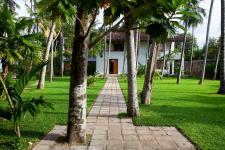 The two wings of the building with its centre courtyard has allowed for fenestration on both sides of the living areas, with a glazed corner window in the pantry and TV area framing the frangipani tree in the courtyard. Master bed room is located over the guest room across the sit-out giving it privacy whilst a bed room in the first floor and the study on the entrance wing contemplates on the coconut grove.