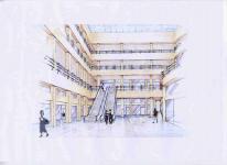 The building designed to integrate with the site form as the site had triangle shape, the building consisted of two building connected with each others with a central skylight.