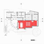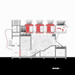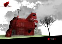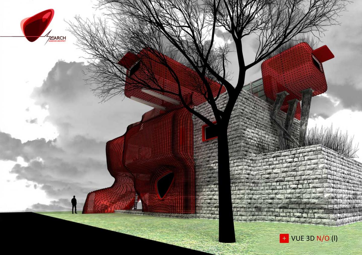 Violente irruption sanguine, ce ‘corps liquide’ s’imbrique à l’angle de l’ancienne batisse lui insufflant la vie, une nouvelle existence. Telle une créature insolite aux émergences tentaculaires, il puise son essence du socle terrestre et se dégage en hauteur, enveloppant les murs de pierre pour ne plus former qu’une entité hybride, où textures et matières fusionnent et se cristallisent en un organisme magmatique. Véritable membrane métamorphique, elle s’articule et s’évide en un grand orifice, inquiétant et hypnotisant tel l’oeil d’un cyclope mythique. Cinq grandes cartouches – réservoirs à habiter – couronnent l’élévation, semblant épier les alentours. Réel catalyseur spatial, EXTENSION 853 opère par le biais d’une série de greffes et points de sutures une véritable ‘transarchitecture’. Pièce prothétique en continuelle mutation, elle confère à la station sa configuration la plus … totale
