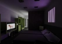 Hotel room in which I created the interior design consists of two parts. Hygiene is the single cell connected to a shaft installation. Its area is 4.26 square meters and the ground clearance as well as in hotel rooms is 2.7 m. Hotel room itself is square with the nature of the associated space corridors. The room has a window associated with the glazing on the top balcony. Its size, along with hall is 18.6 square meters. My design is based on the linked space corridor and room. Through this space passes furniture set. Over the set is formed shaped tear walls ending in a peripheral wall. In the tear is situated ambient lighting. Over the bed are positioned halogen lights. Behind the bed, there are cut into the shape of the holes through which passes mood lighting created by controlled RGB LEDs. Beds are movable, fixed-rail system in the plinth wall. Room also contains a work desk with lamp. The wall furniture system contains a fridge, open rack, TV, small storage space, three cabinets and niche with tilt seating. The room has carpet. Wallcoverings is created by paint or wall bright textile. Light transmission through the window can be deleted with a combination of downloadable laminate curtains and blinds. In bathroom I used a material combination of gress tiles and mosaics. The mosaic is also lined the sink counter. Underneath is a wooden sliding box. The bathroom is a bottom, which lowered the ride height of 2400 mm. System is formed Barrisol with transparencies, over which are placed transversely LED diode strip imitating fluorescent tubes. Over the sink is a mirror with low voltage bulbs on the sides.