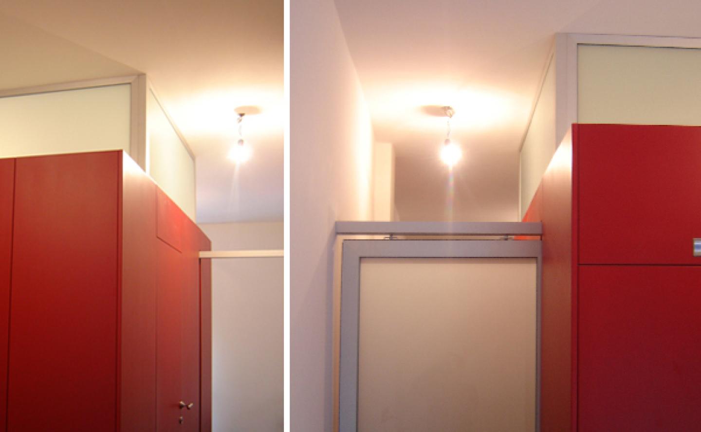Within a refurbishment of a small two-room apartment in Milan it was decided two collect all the service functions of the project in a central hardcore, leaving maximum freedom use in the remaining space. The hardcore, entirely covered in MDF and varnished in red, contains in its center the bathroom and integrates all the closets, the kitchen area and a foldable table. Its walls at the top leave space to a glazed glass frame which during the day let natural light penetrate inside the bathroom. During the evening, lit from the inside, the core becomes a lantern which illuminates the rest of the apartment.