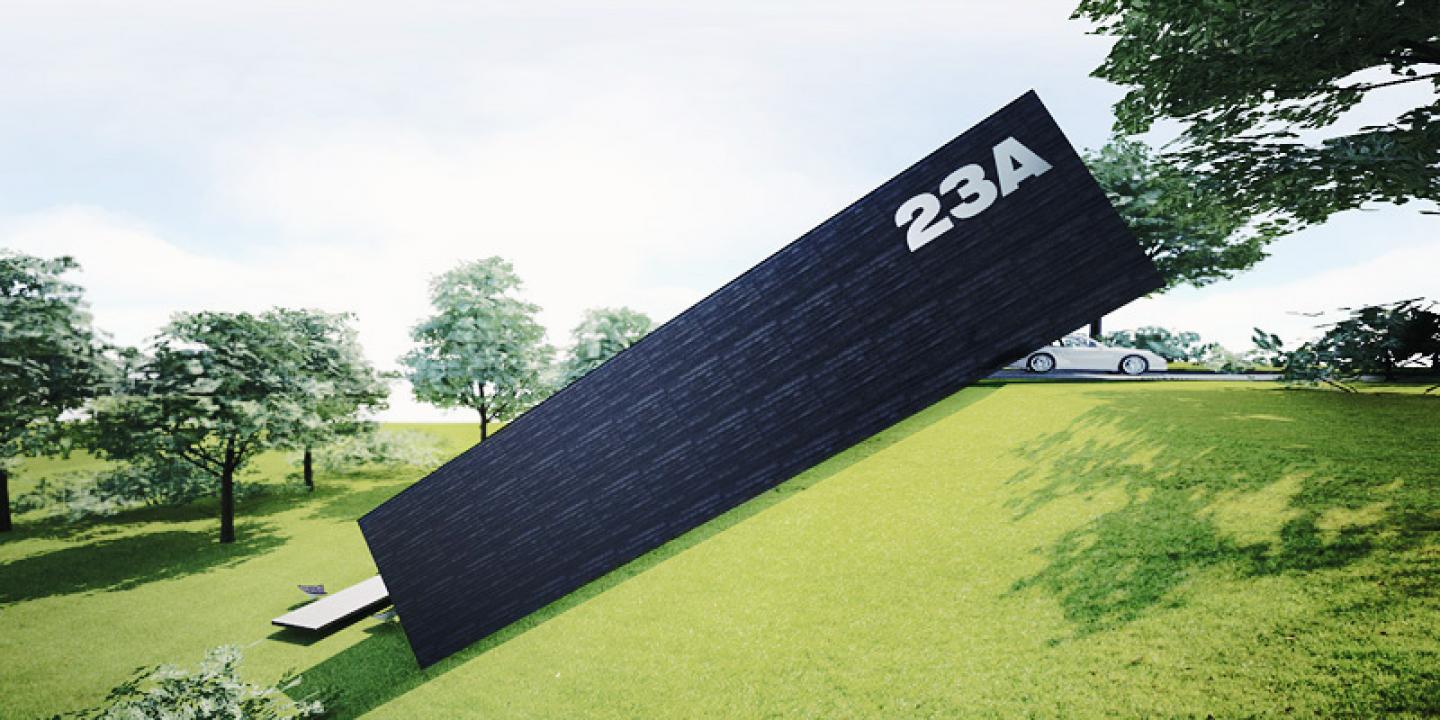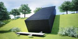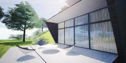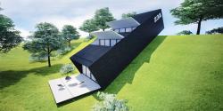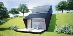 This single-family detached house is situated on a 30º-sloped area with a southern exposure.The idea of a sloping rectangular form containing three-level utility area with a reverse function is a result of difficult terrain and the willingness to isolate from the busy road from the entrance side. Terrace and roof hydraulically controlled covers allow the residents for the isolation from the hectic, outside world.