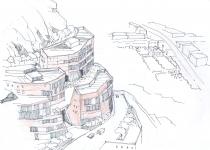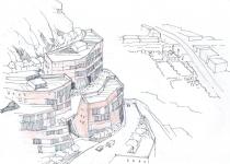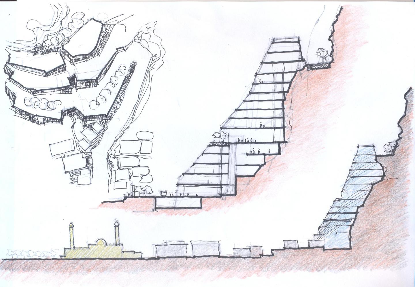 Landscape tower consists of 25 or more levels. Ascending through congested low profile urban fabric, towards foot hill. Entry remains on 10th floor level climbing to entry terrace. Tower consists of several blocks; each having layers and mini terraces.