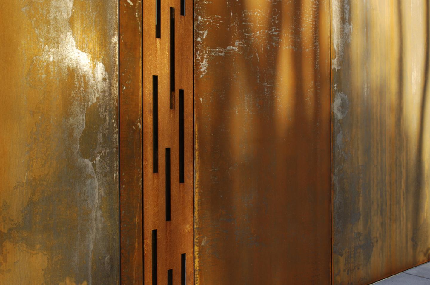 The pavilion Madeleine and the newly designed “Park Ouerbett” built together the new centre of the community of Kayl-Tétange, located in the south of the grand duchy of Luxembourg, close-by the industrial quarter Esch-sur-Alzette. The building is arranged at the intersection point of the north-south trail and the loop road of the park and attracts not only the visitors of the park with its exterior and interior structure. With its basic dimensions of 10 x 22 x 4,5 m it fits harmonically in the park structure. The structural concept relies on a pillar-girder construction, which is based on an insulated bottom slab. The pillars are arranged in a grid of 2 x 2 m and hold the 10 m long IPE400-girders. All steelwork parts are screwed. The transparent post-and-rail-façade has been equipped with sun shading glass. A corten-steel façade covers the volume in its artless and simple cubature, which is interrupted by several glass cuttings of storey height. The pre-located terrace in the south with its barbecue station and about 40 seats defines also the entrance and leads the visitor through a glass door directly into the building. There we find a restaurant with another 40 seats. Harmonious materials as well as a generous room height in the restaurant area offer the visitor a high quality of stay. The unadorned walls contrast with the black steel chimney construction, the representative wine cupboard and the bar made of the same material. The 3 elements emphasize the clear lines of the pavilion and bring its outer robustness inside. In contrast to this but at the same time harmonising with these elements, the parquet floor and the 3 gold-coloured suspended lamps offer a warm and comfortable atmosphere, which is especially in the winter supported by the fire in the chimney.