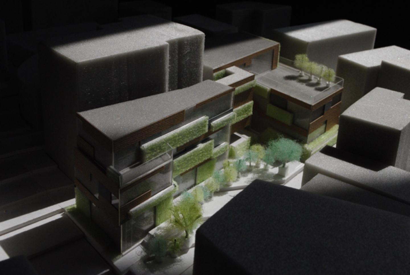 This project’s façade consist of mainly generating natural atmosphere, four different materials: wood, soil material, green, and glass.