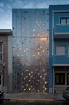 The west facade is covered by aluminum venetian blinds that not only defend the interior from the insulation but also open the house to a small garden. At east, the house gets its identity. The intimacy is guaranteed by stainless steel panels, perforated with the siglas poveiras. These symbols are a proto-writing system once used as a way of communication and to mark personal and fishing belongings. Also, they were hereditary and constituted an important family legacy that was transmitted by inheritance through generations, evolving with new combinations.