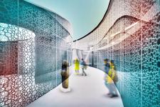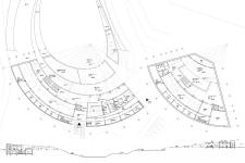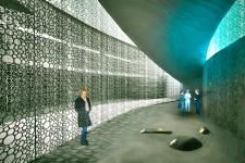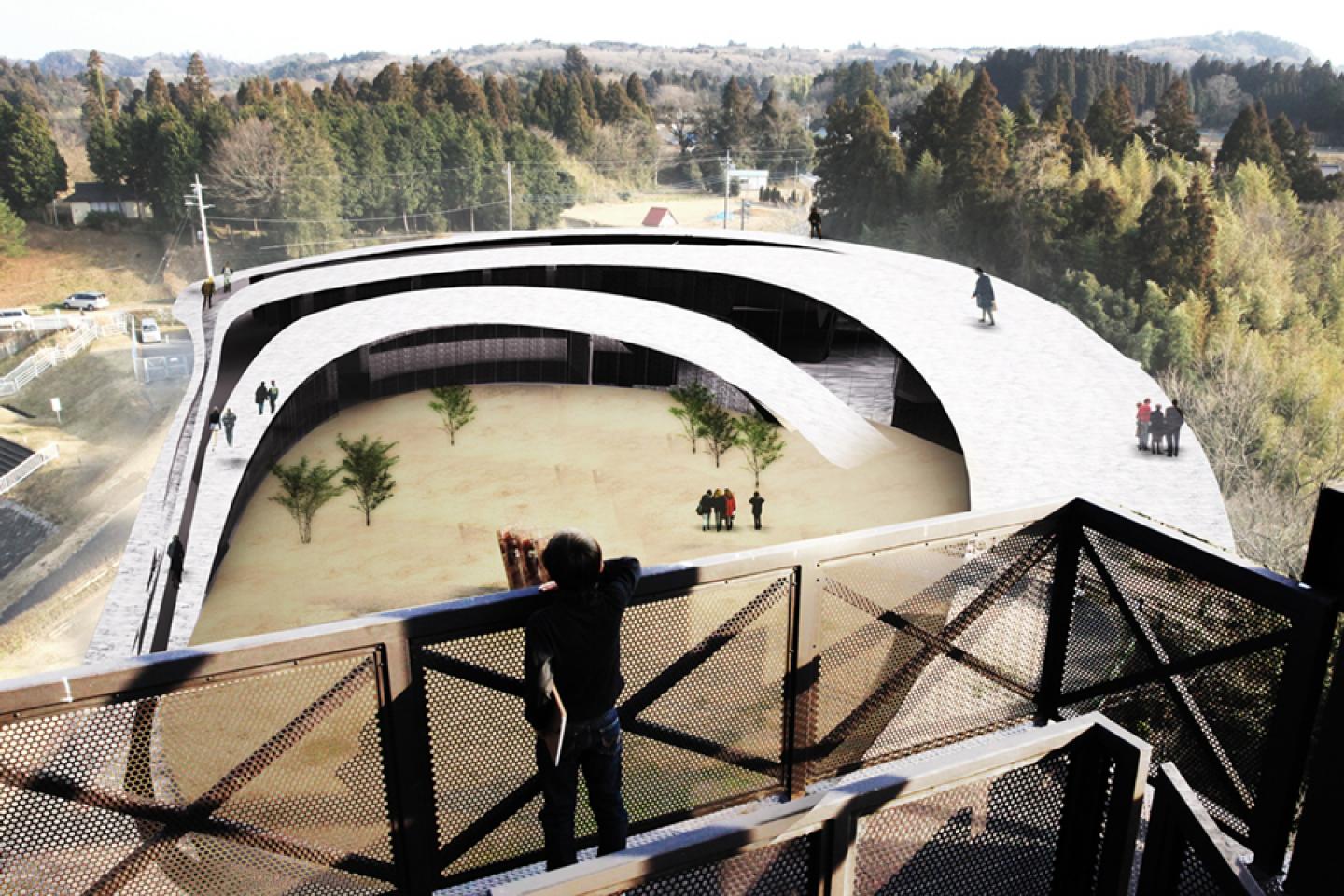 Roof is like a ribbon wrapping around the existing building. These ribbons connect the roof of the pre-existing building, garden, and the lakeside together. They form spaces that connect the outside to inside and visitors can walk around them.
