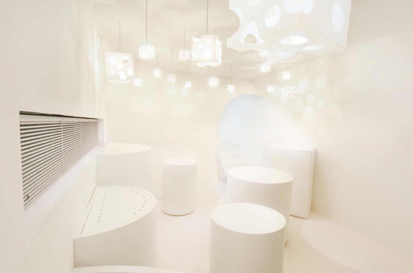 Inside the building, customers can see the superposition of cheese selling and food tasting spaces through the holes in the walls similar that of a piece of cheese cellar.