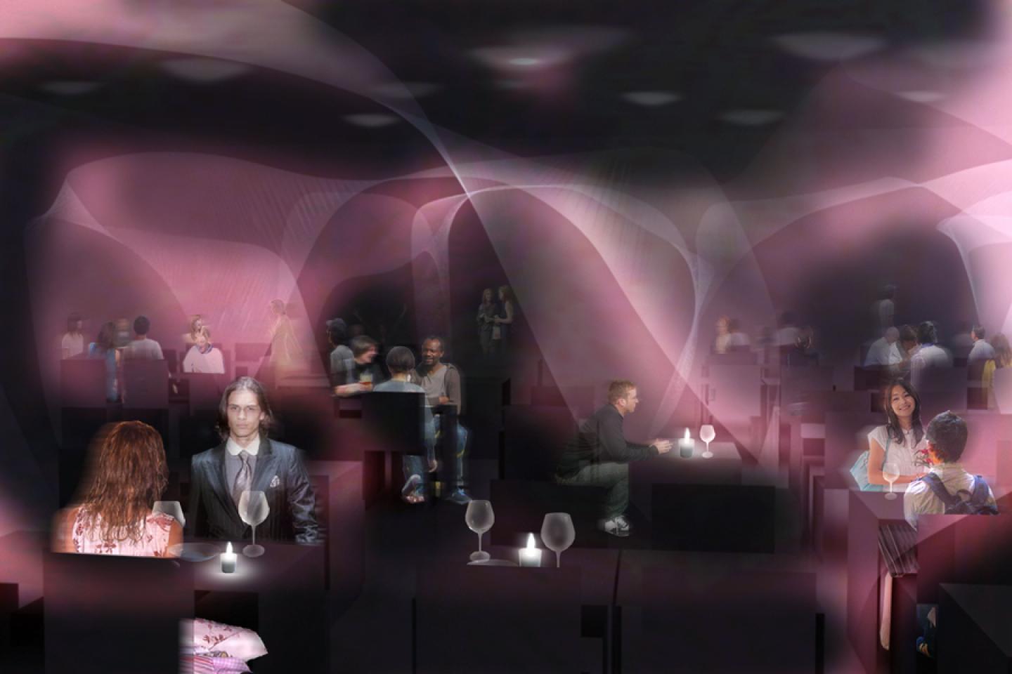 The aluminum frame forms two cubic curves. The surface is covered with stretched transparent fabric divide the spaces.